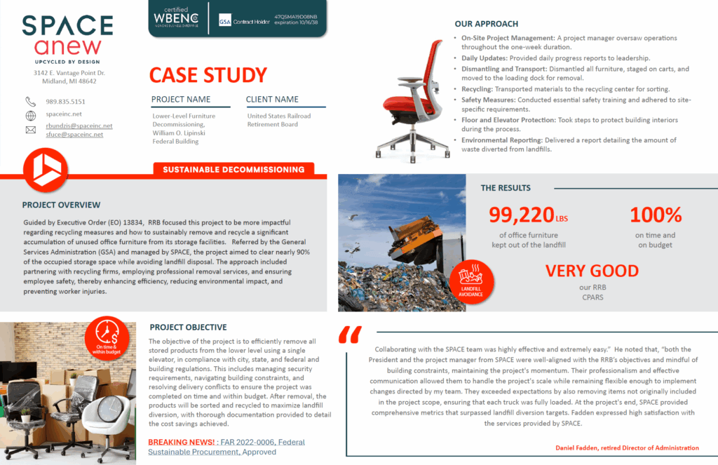 Our commitment to sustainability just got a major upgrade with the utilization of our SPACE Anew program! Guided by Executive Order 13834, we had an opportunity to revolutionize furniture decommissioning with a focus on eco-friendly practices and community impact.